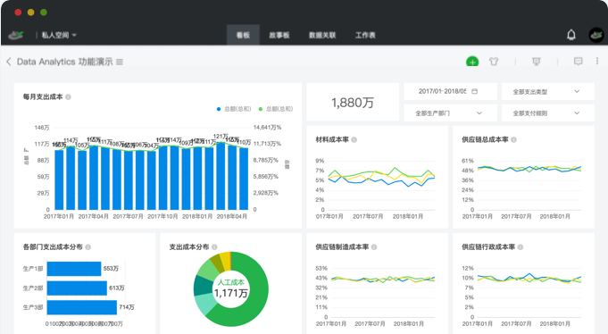 這是一款用于企業數據可視化分析的自助式敏捷BI產品,可以針對企業業務數據進行自由維度的探索式分析,釋放IT壓力,真正將數據分析工作交還給最懂業務的人,提高企業決策效率。